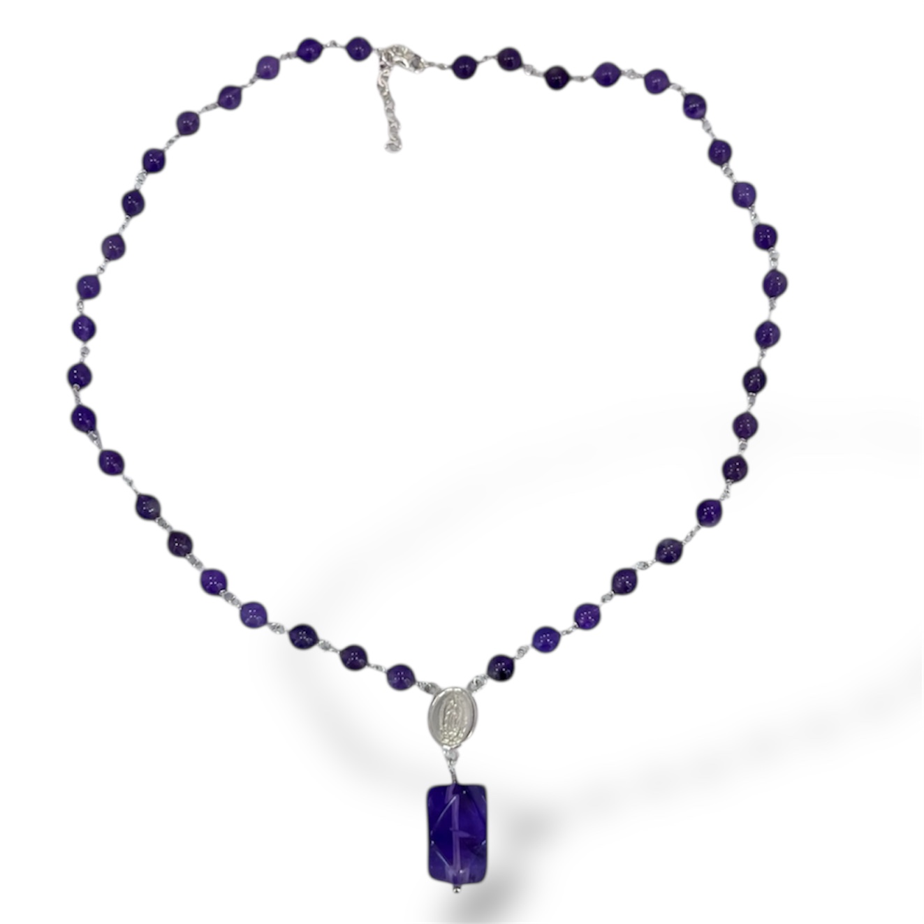 Collar de Amatista y Virgen de Guadalupe de Plata. Medida 50 cm.