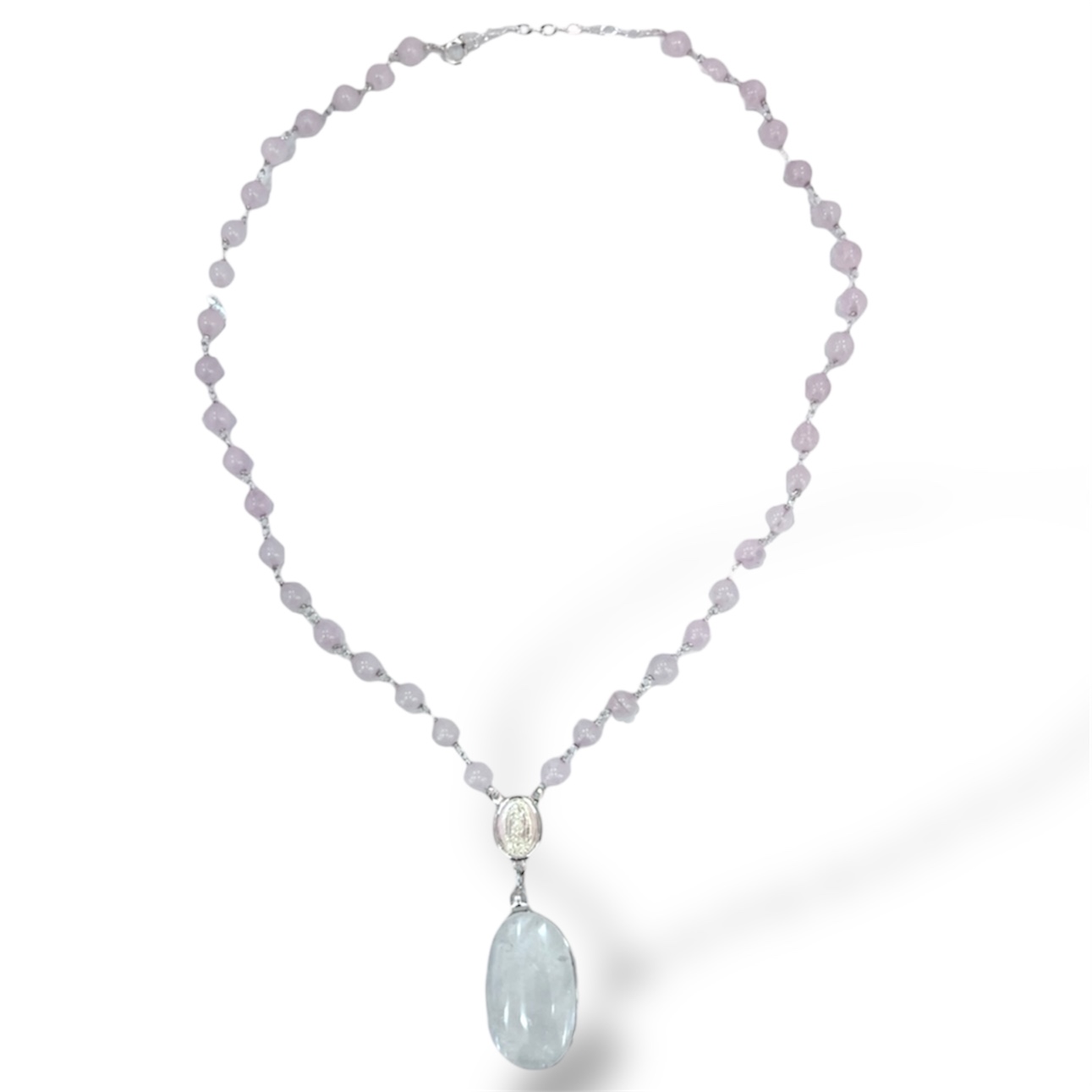 Collar de Cuarzo Rosa, Cuarzo Cristal y Virgen de Guadalupe de Plata. Medida 50 cm.